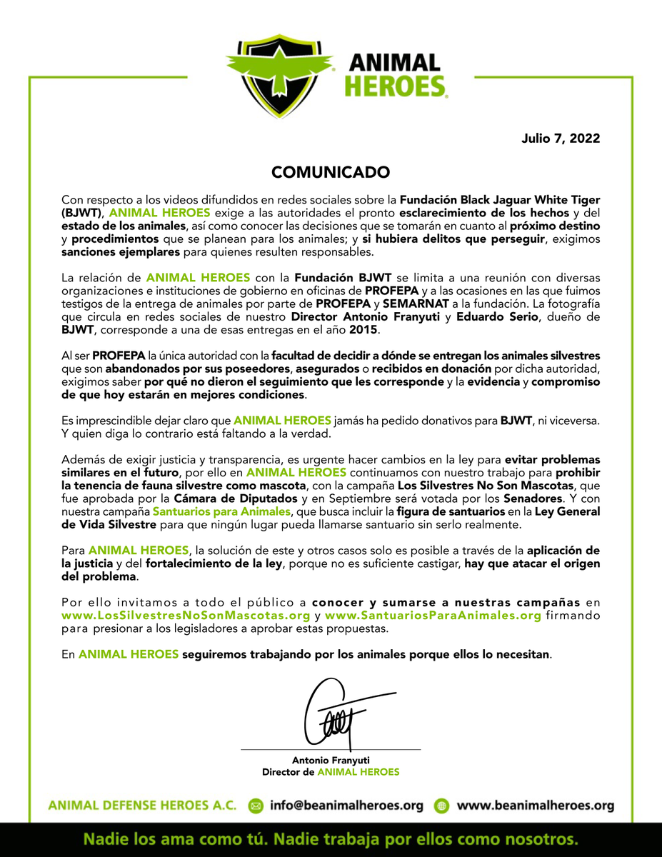 ¿Por qué se abrogaron la facultad de decidir por los gobiernos que la privatización de las labores de conservación en sitios como la Jaguar es un modelo viable? ¿Cuánto dinero ha fluido entre el gobierno, Black Jaguar White Tiger, Animal Heroes AnimaNaturalis? ¿De dónde proviene su financiamiento en general? Como bien señaló Franyuti, sin él y los Naturalis el animalismo de protesta no tiene el alcance que ellos aportan. ¿Estará por destaparse un escándalo?