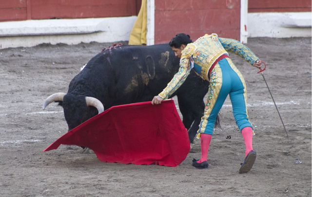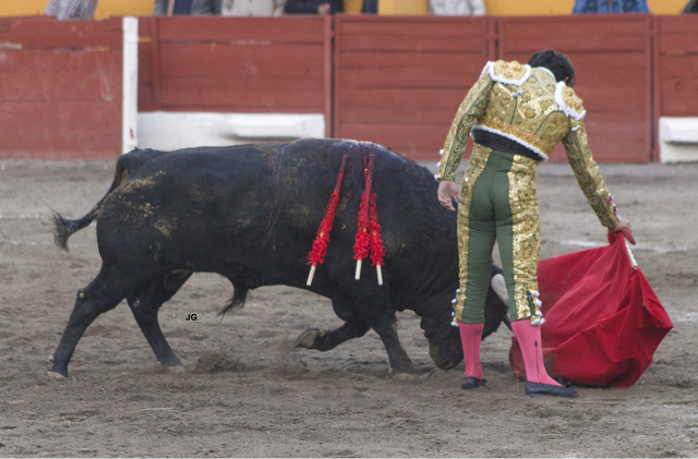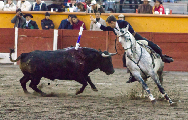 Comenzamos el día 25 en Apizaco. Dada una racha de mala suerte, no pudimos entrar a la plaza durante el primero de la tarde, que lidió Guillermo Hermoso de Mendoza. Sobre el cuarto, el menos de trapío de los cinco de Fernando de la Mora que ví, Hermoso gustó a la concurrencia toreando a la grupa y cambiando los terrenos mientras el toro tuvo acometividad. Pronto vino a menos y ni llegando a la cara se arrancaba a las cabalgaduras. Falló con los aceros y perdió algún trofeo.